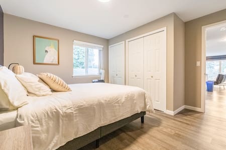 We have a spacious bedroom with following: - Queen bed with Firm mattress (Guests are always asking where to buy!) - 100% cotton high quality white linens - Two night stands (end tables) - Alarm clock - Closet with lots of hangers - Dresser